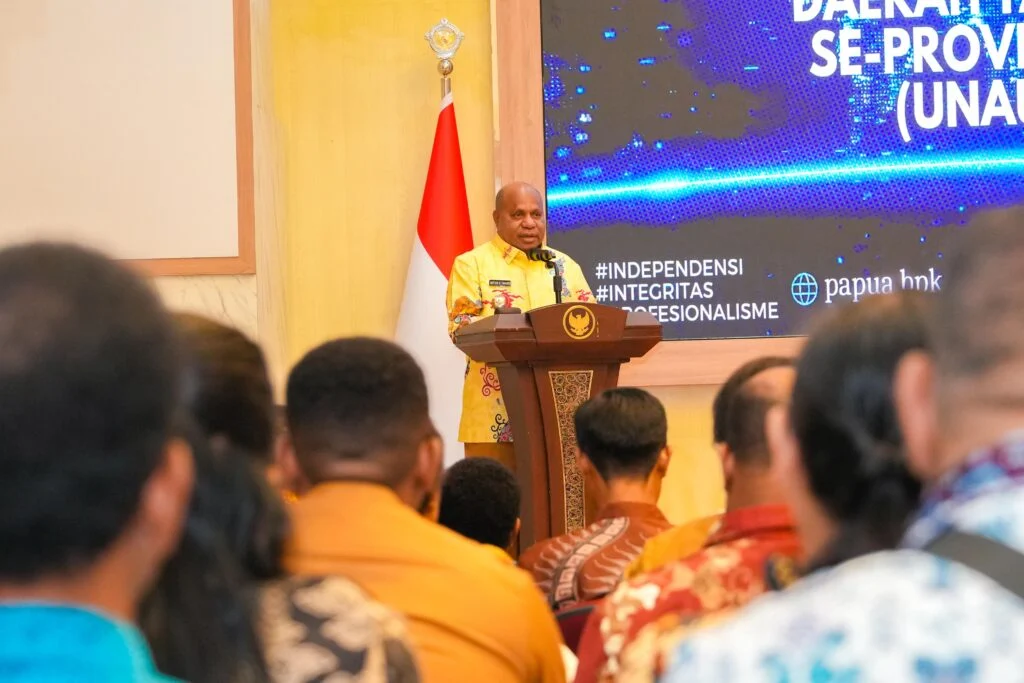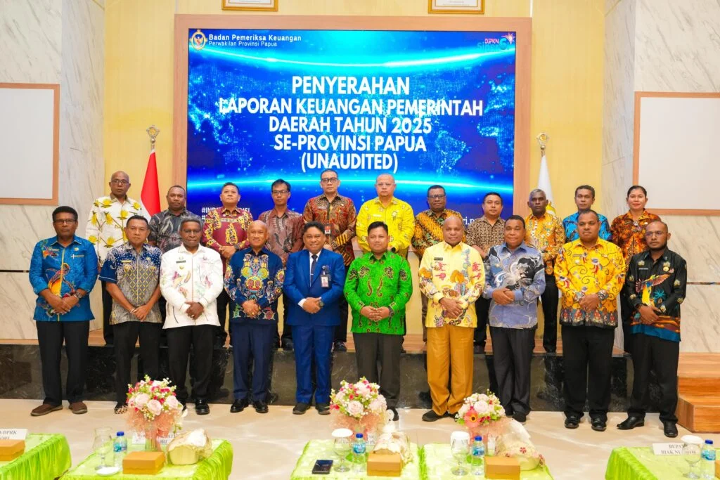JAYAPURA, admediapapua.co.id – Gubernur Papua Matius D Fakhiri menghadiri kegiatan penyerahan Laporan Keuangan Pemerintah Daerah (LKPD) Tahun Anggaran 2025 yang berlangsung di Kantor Badan Pemeriksa Keuangan (BPK) RI Perwakilan Papua, Senin (30/3). Kegiatan ini diikuti oleh Pemerintah Provinsi Papua serta pemerintah kabupaten, yakni Kabupaten Biak Numfor, Supiori, Kepulauan Yapen, dan Waropen.